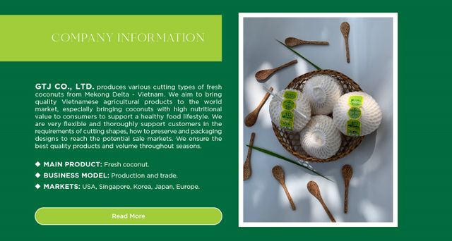 You are viewing details for Semi-Husked Young Coconut Cling Film Wrap Green or red Colours Hat Cut Shape Coconut from Vietnam. The information provided here is either posted directly by the supplier, who is responsible for its accuracy, or collected by Freshdi AI from publicly available sources. Freshdi strives to make product information as useful and reliable as possible, but we do not guarantee complete accuracy. If you notice any incorrect or misleading details, please use the Report Product option so our team can review and address it quickly.